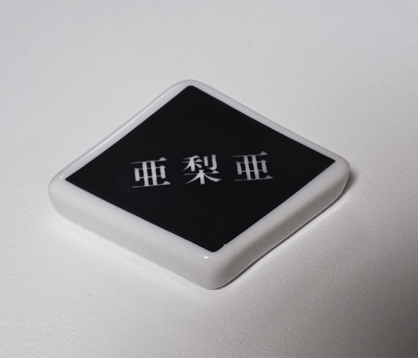 アクリル製としては、とても透明度が高いのでデザイン次第でとてもかわいい箸置きが制作できます。底面からフルカラーで印刷を行います。印刷範囲は、縦24mm×横19.5㎜の楕円形です。