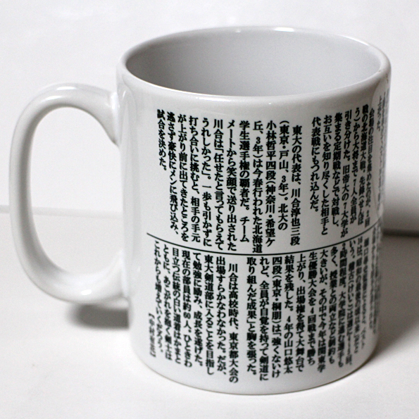 全日本学生剣道大会の成果をマグカップにしてプレゼントした例です。解像度は非常に細かく印刷可能なので、この様な細かい記事も印刷可能です。デザインとしても素敵ですね。デザイン加工をご依頼いただければ、当方でご要望にあったデザインをお作りいたします。